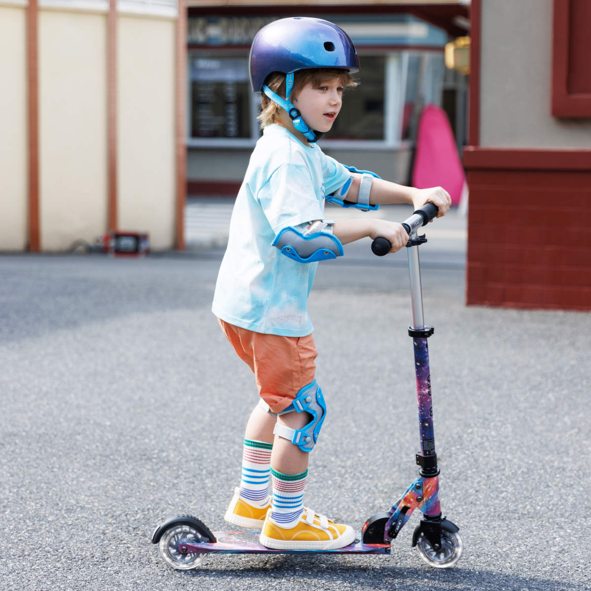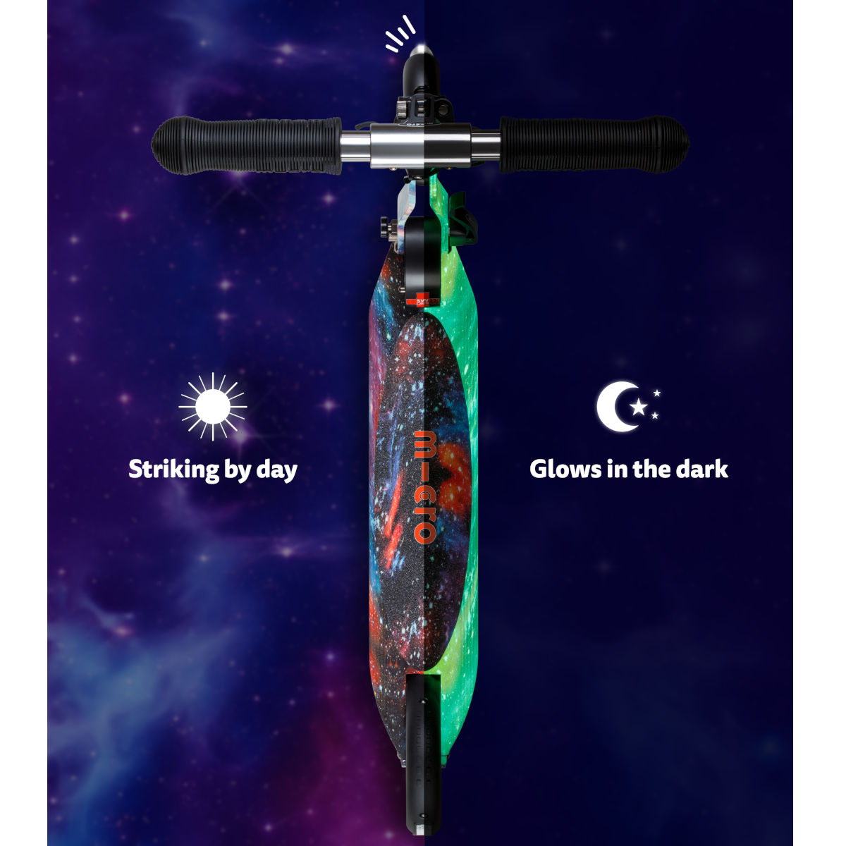 Použitá technologie Glow umožňuje, aby se koloběžka po nasvícení jemně rozzářila ve tmě. Vizuální efekt doplňují LED kolečka, která podtrhují celkový vesmírný dojem a dodávají jízdě magickou atmosféru.